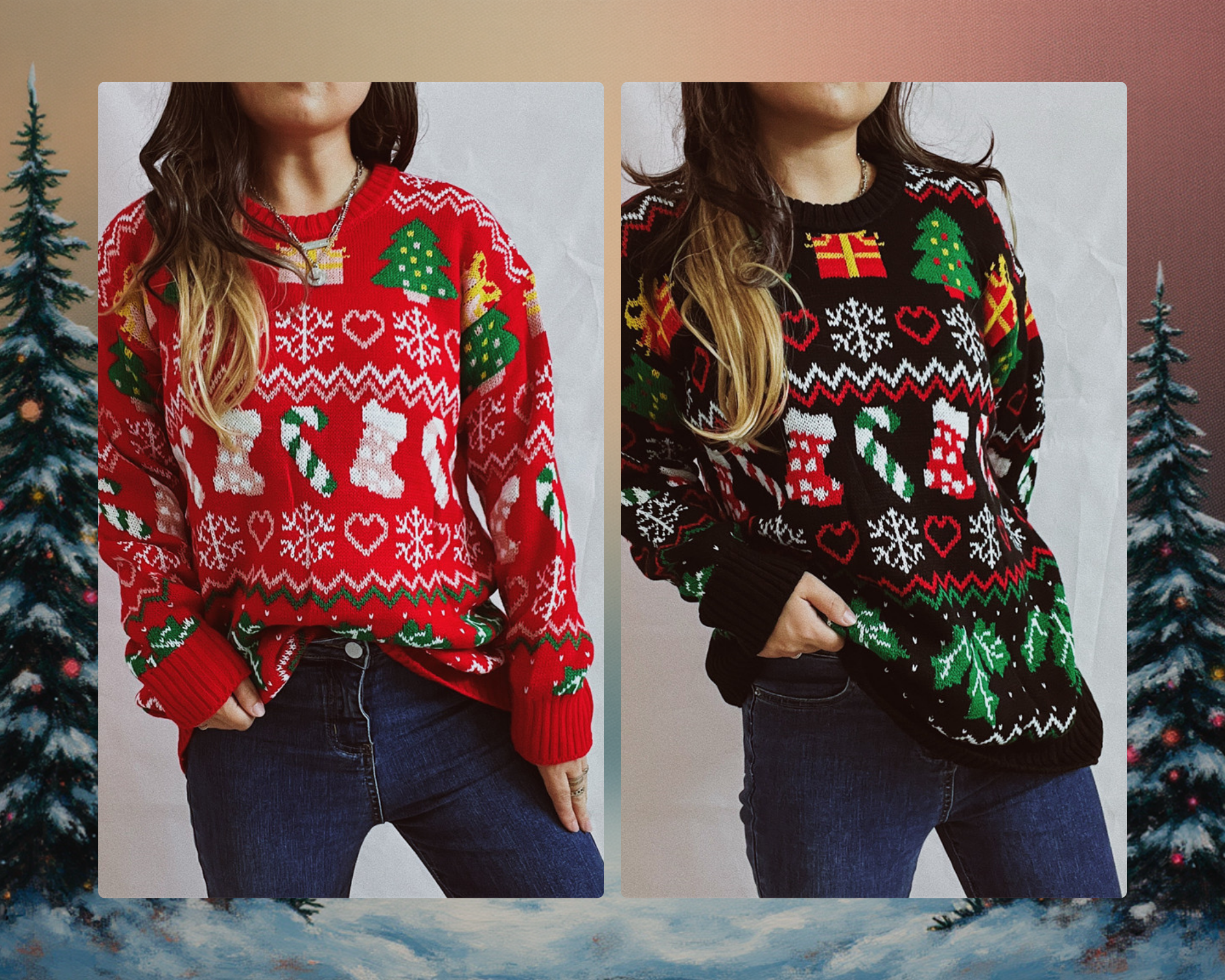 Perfect for holiday festivities, this knitted Christmas-themed garment in bold red or classic black offers comfortable wear and festive style for various holiday occasions.
